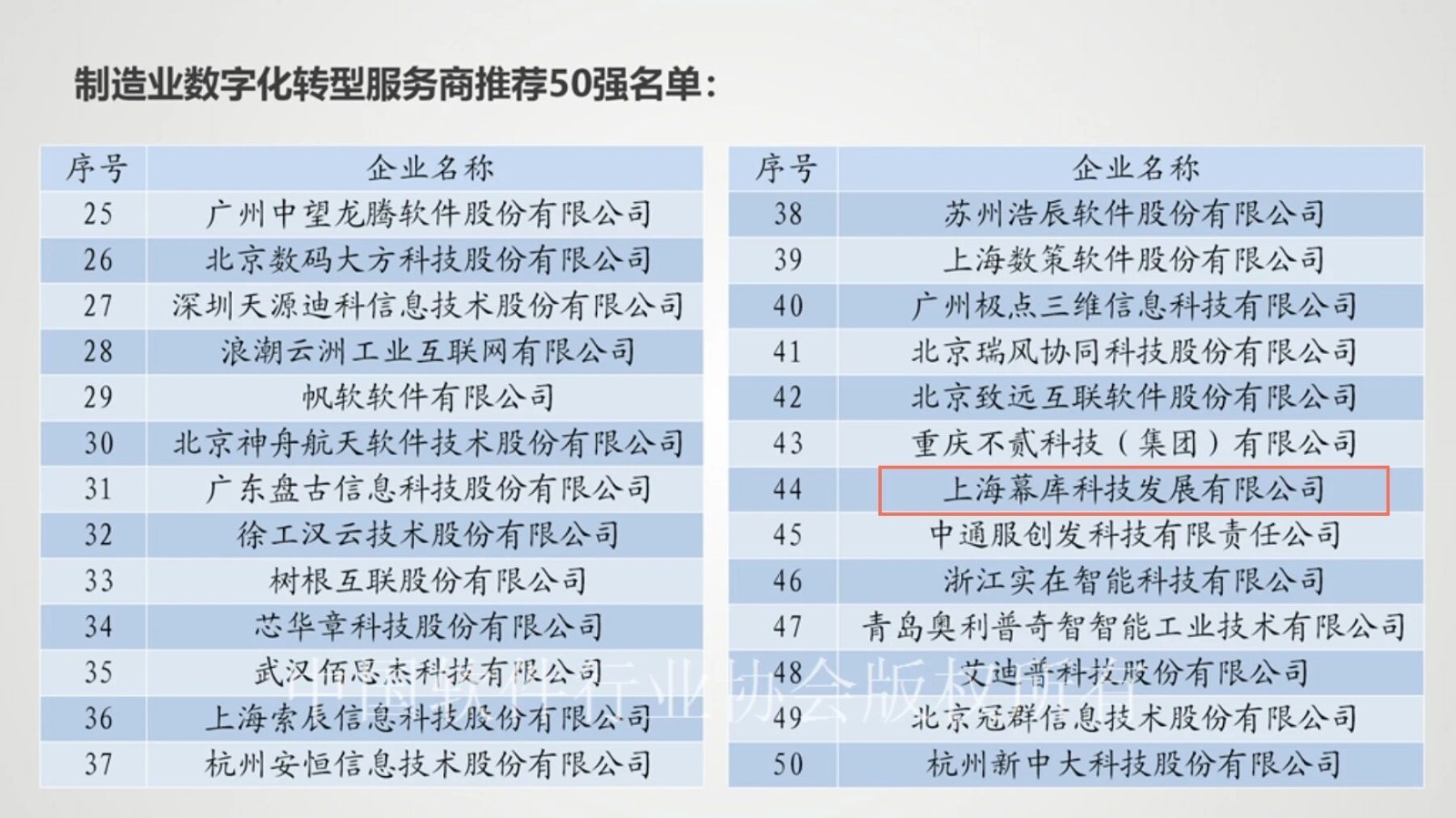 近日,在2025 軟件創新發展大會上,中國軟件行業協會重磅發布《制造業數字化轉型發展報告(2025)》,并同期公布“制造業數字化轉型服務商推薦 50 強名單”。上海幕庫科技發展有限公司憑借在制造業數字化轉型領域的突出實力與創新實踐,成功入選該名單,躋身行業核心陣營!